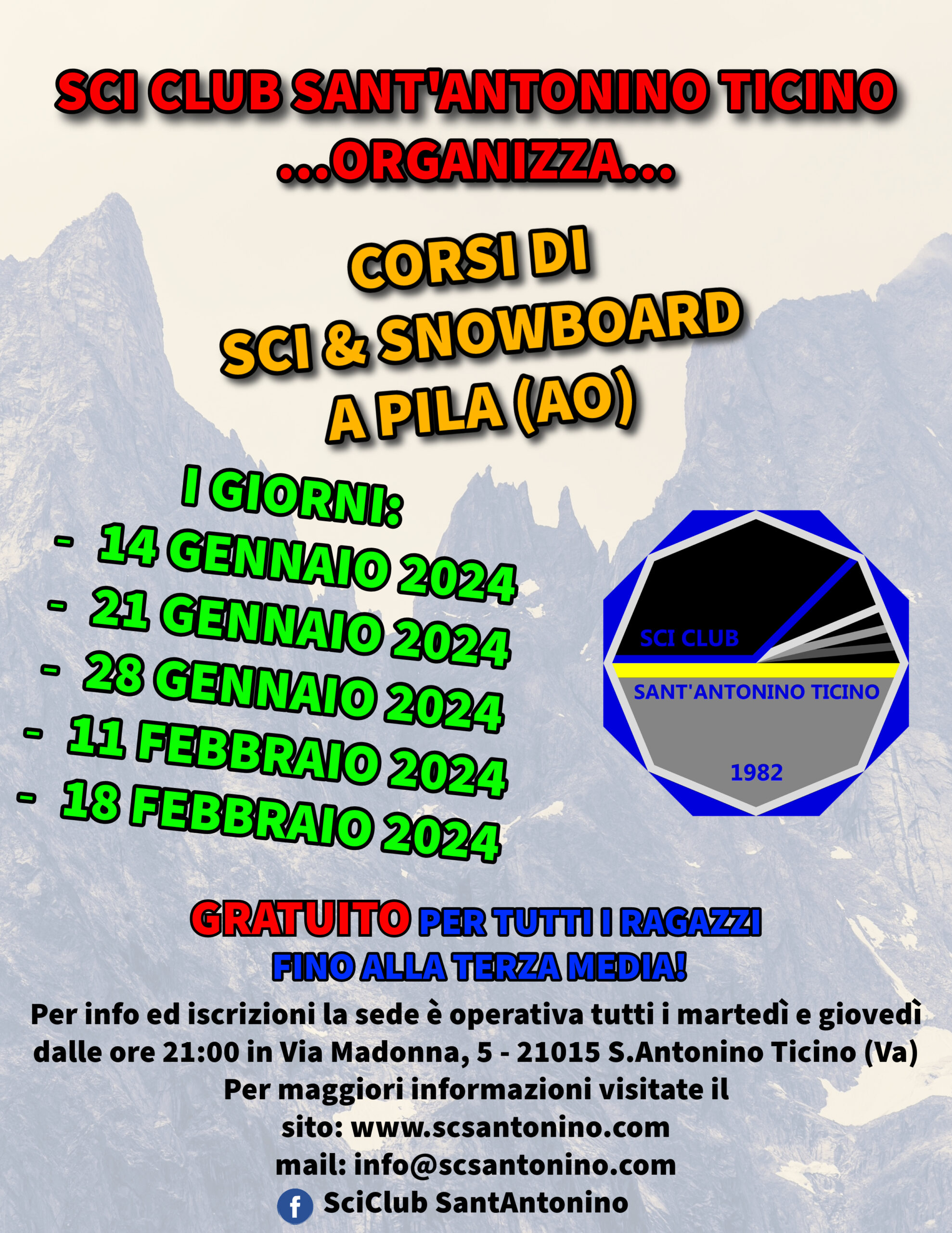 I CORSI DI SCI E SNOWBOARD si terranno a Pila (Ao) le seguenti domeniche: 14 – 21 – 28 gennaio e 11 – 18 febbraio 2024.